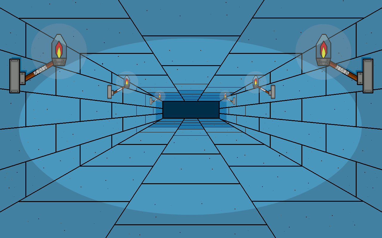 Un lungo corridoio illuminato da torce. Puoi solo proseguire dritto.